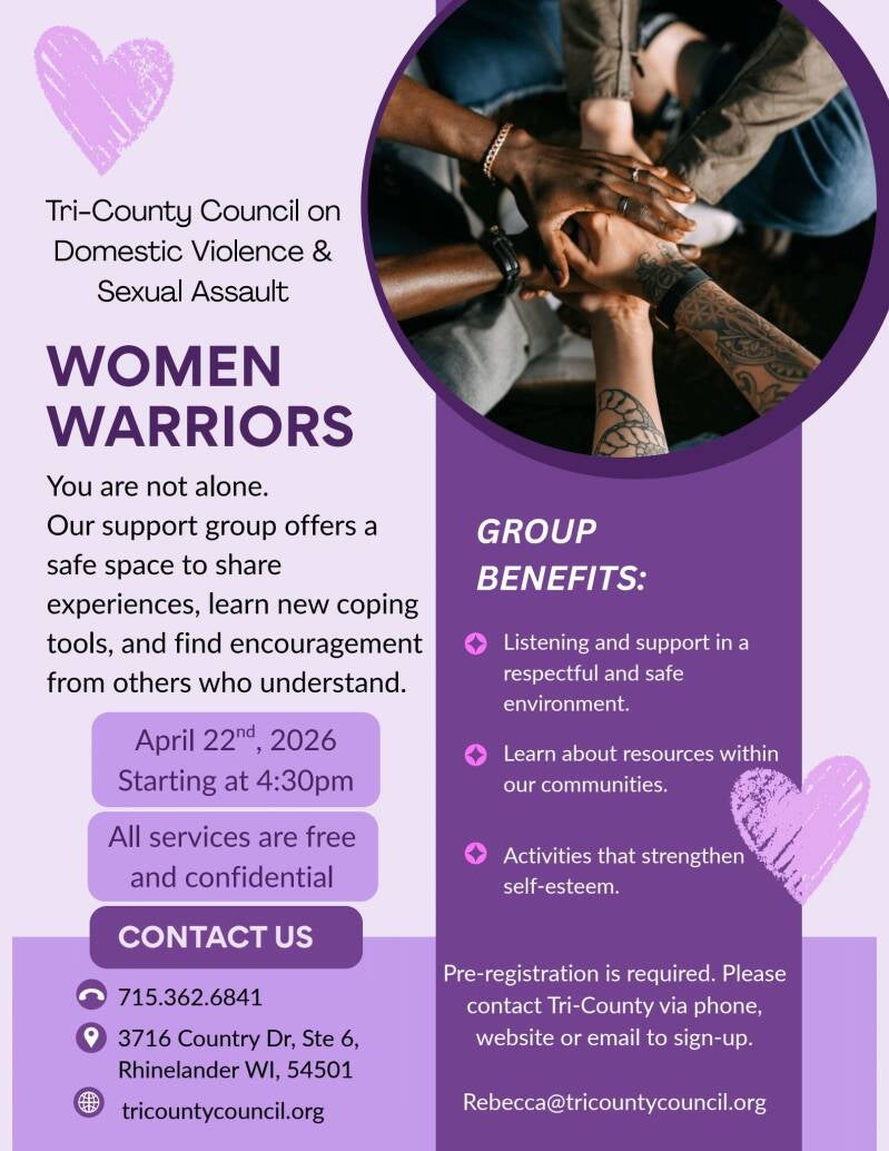 Join us on April 22nd at 4:40pm for our Women Warriors support group. Our support group offers a safe space to share experiences, learn new coping tools, and find encouragement from others who understand. Reach out to us at 715-362-6841 for any questions. Thank you!