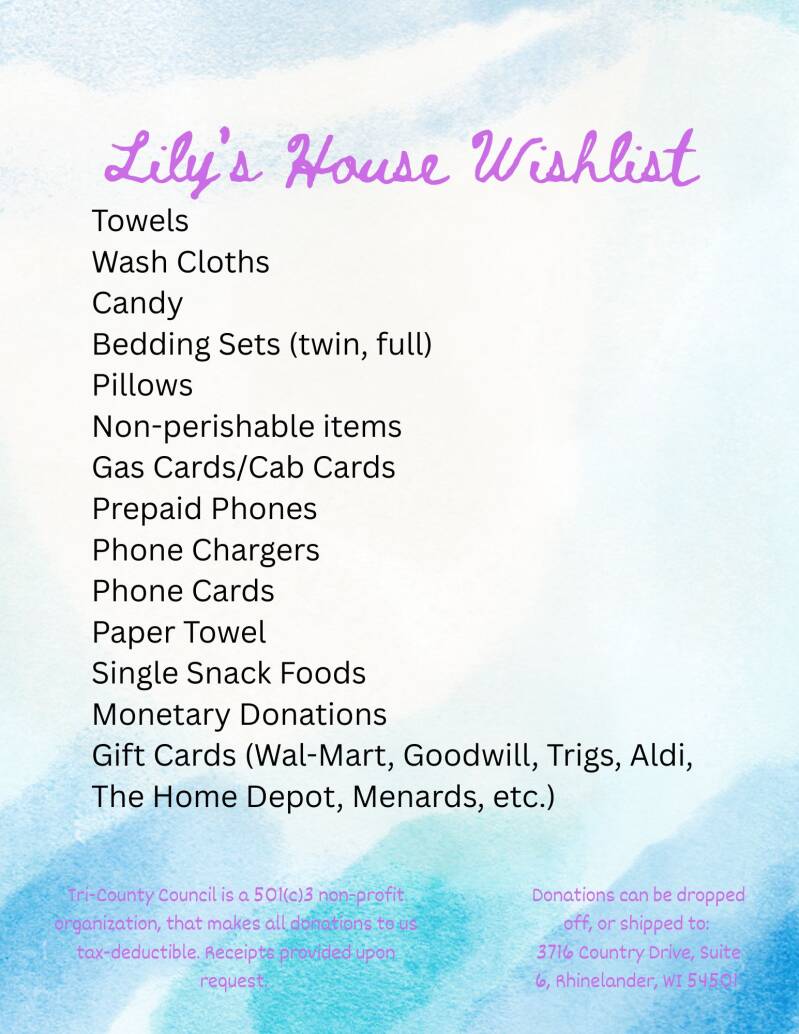 Any donations can be dropped off at our Administration Office at 3716 Country Drive, Suite 6, Rhinelander, WI 54501. Here is a current and updated wish list for our emergency shelter, Lily's House.